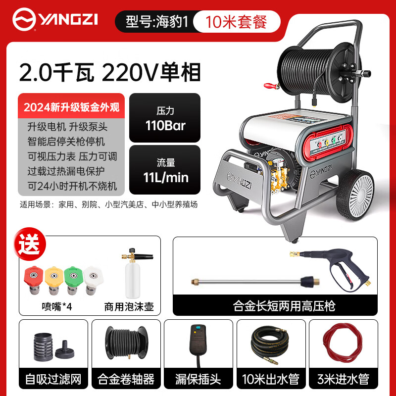 揚子海豹洗車機洗車高壓水槍高壓清洗機大功率工業(yè)洗車水槍220v洗車店養(yǎng)殖場洗車泵,商用級銅制感應電機澎湃動力三重防護,2000W-5500W商用風冷感應電機,智能調(diào)壓閥輕松掌握精準水壓。